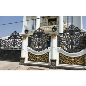Pagar ini memakai gaya klasik Eropa dengan ornamen rumit berbentuk floral dan lengkungan simetris. Warna dasar hitam dipadukan aksen emas pada titik-titik tertentu sehingga tampilannya sangat mewah dan berkelas.