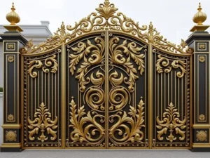 Warna dasar hitam matte membuat detail emasnya terlihat lebih menonjol dan berkelas. Pagar seperti ini cocok untuk fasad rumah mewah yang ingin menonjolkan kesan elegan dan dramatis.
